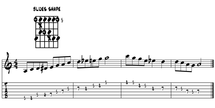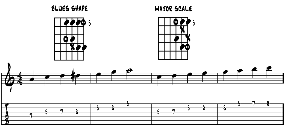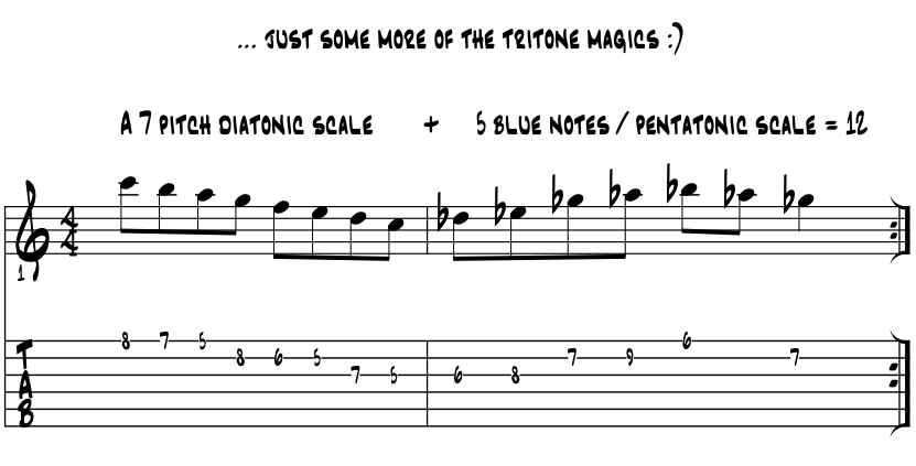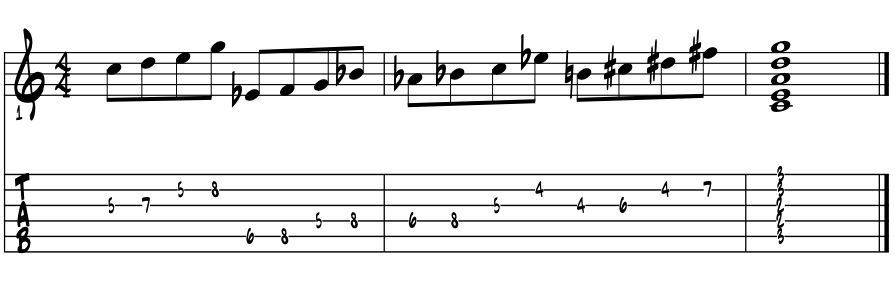 | Look familiar? Pretty sure that A minor pattern was the first one I learned. And the C major is the shape used for creating all of the melodies in the 'by ear' songs sections? Tis' is indeed, well after adjustments that is. Such as? Well, to make the 'blues and butter' we need the tritone color too. Add it in shall we? Sure. A one pitch, octave splitting tritone for the blues and a two pitch, tritone interval to make the butter. Example 10b. |