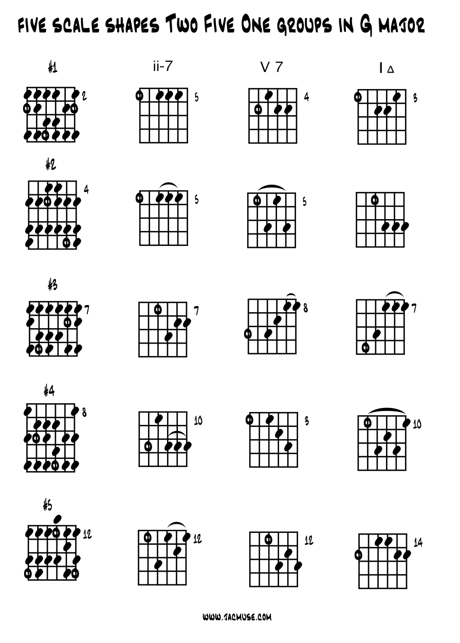 | 36b ~ Quick review; jazz scale and chord shapes. Here's a quick and condensed review of the five scale shapes and associated Two / Five / One chords. This one pic might be worth a screen shot / printing and posting for easy reference. Author's note. Once solid with the diatonic running of the pitches, keep a basic shape and chromaticize the location by filling in the spaces in between the black dots. Keep aiming for the open circle pitches as they are the tonic note of its key. Example 10f, (no audio). |