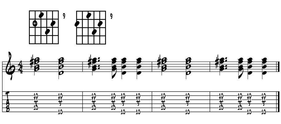 | Tricky fingering? Don't fight it really. How a 'thing' gets played is all about where we find it, how fast, what follows etc. Chances are we won't ever really need the whole shape most of the time. Focus on locating the notes of the group, their letter names. That said, there's a fingering hand solution to this next chord, find the root with your middle finger and the rest should fall right into place. Same finger alternates our bass pitches. Here's the 'major 9' chord voicing that lives in the middle of major scale shape #4 with an alternating One / Five bossa bass motion. Example 9a. |