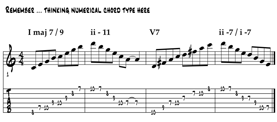 | Arpeggios from scale shape # 3. By thinking numerical and chord type, these four arpeggios are keepers for sure. The first is a tonic staple, which also shapes the basic launch pad to #15. The minor Two in the second measure is right back to the tonic arpeggio shape first seen back up top. Now starting on the second scale degree. Modal? Yep right up to 11. Measure three has a vanilla V7 shape, but know there's a diminished / b9 scale shape right underneath here in shape # 3. The fourth bar is a straight up minor 7th arpeggio, so either a Two or tonic. Again, all are keepers really. Consider rote memorizing a shape you dig and then running it chromatically up and down the neck to lock it in, keeping track of roots pitches etc. Example 8b. |