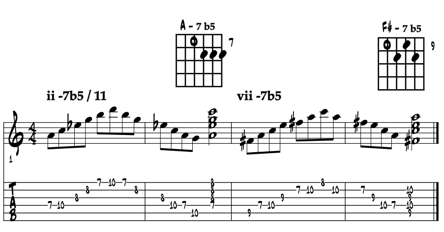 | And the balance. Let's resolve these half diminished chords to the relative minor side of 'G major / E minor.' Example 7e. |