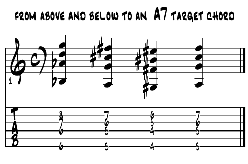 | Just this last bit of theory can create a ton of potential resource a couple of ways. We double the number of available Two / Five cells with the tritone sub addition. The half step lead in root motion, by its proximity to One and resolution, can be a true swing accelerator, really beyond any other chordal motion we have. That we get five basic Two / Five pairings, one from each of the five scale shapes, now jazzed up with a tritone sub, nicely expands our harmonic resources in one fell swoop. That Two / Five happens so much in performing jazz standards, learning this might be a jazz guitar 'must', one very worthwhile as the swing is built right in :) Author's note. Learning of the tritone sub totally changed my development, nearly overnight and hopefully, it just might for you too. These were the voicings. Thinking in 'A' major. Example 26b. Scoots right along huh ? Yea, chromatic and sleeky. |
