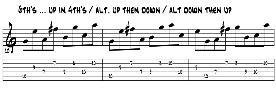 | Regardless, it's a real burner for a lot of cats and super buttery for a lot of Americana melody coolness. In this next idea we simply sequence the pitches of the shape in thirds creating a commonly heard melodic idea throughout the literature. Basic G major scale motion descending in 3rds. Example 8a. |