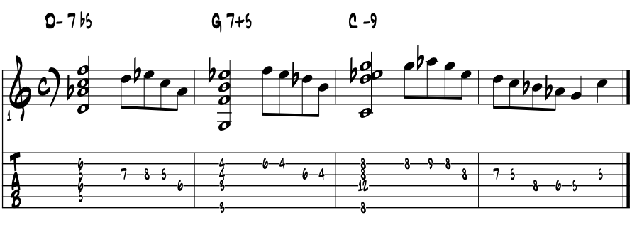 | Two / Five One shapes for scale shape # 2. Let's find the movable Two / Five / One chord shapes within scale pattern #2. Adding a 9th to Two, a common enough jazz color, and getting new brand shapes for Five and One. Example 7c. |