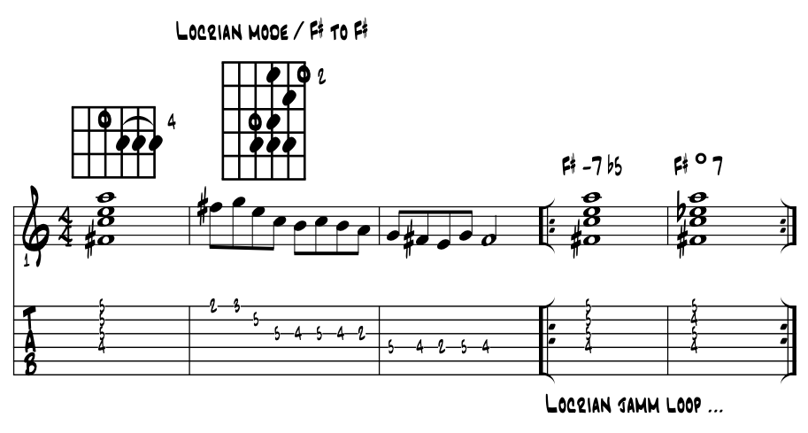 | Locrian mode. Clearly minor but with a twist; the b5 of the triad creates the diminished triad color. One of a kind, and not ever a tonal center, the Locrian color becomes the pivot chord and melodic color between the two parts, major / minor pairing of our modern diatonic tonality. The jamm vamp shifts back and forth between Locrian half diminished and fully diminished 7th chords. Example 25g. |