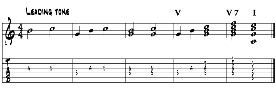 | Leading tone in V / V7. In a major key center, the leading tone pitch is right plum smack dab in the middle of the diatonic major triad we build on Five. It'll pair with Seven, to create the essential, two pitch tritone pairing within V7 that makes the tension we resolve in the 'V to I' / Five to One cadential motions. Please examine these letter pitches and their aural magics, thinking in 'C' major. Example 6c. |