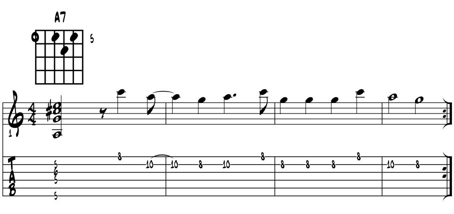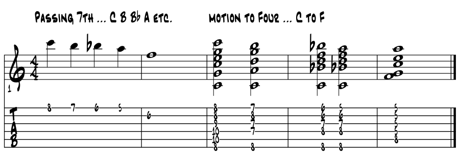 | In a major key. Easy in theory, yet super powerful emotionally, timing this lick can be tricky at first, as this 'passing 7th' bass line often directs us right on over to Four. Example 6c. |