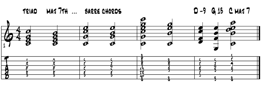| Leading tone in harmonies / tonic One chords. Jazz and pop players build this major 7th pitch into their harmonies, creating a lovely softened, yet still passionately directed tonic color for supporting their melodies. We'll hear this color all through our Americana styles today, as its an easy way to jazz up any song in any style. In this next idea, we 'soften' major triad voicings into major 7th shapes. Please examine the pitches in 'C' major. Example 6b. |