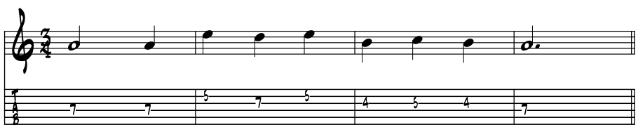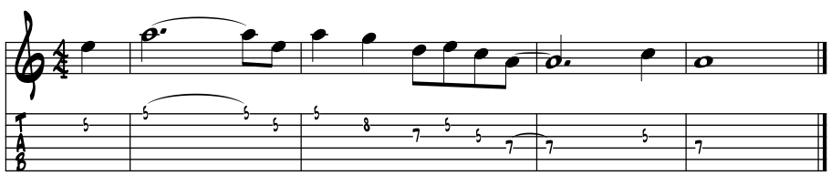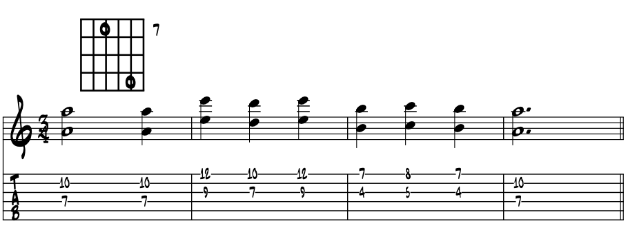 | Nowadays, most jazz players find a way to work in this very cool octave doubling sound somewhere in their music. Here, try this first phrase of "Scarborough Fair" in octaves. In 'A' minor, Example 7b. |