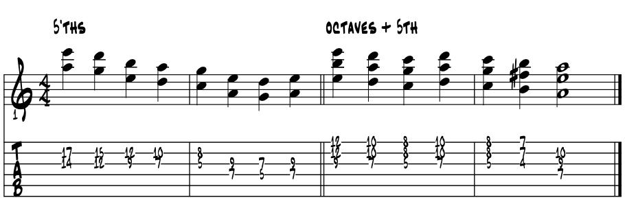 | Root / fifth melodies. The idea of combining the perfect fifth with melody notes is not all too common, but it is in the literature and can be a very powerful sound. Blues rocker Duane Allman does this a bit as does jazz man George Benson, who sometimes adds a fifth between his octaves to turn up the heat a wee bit more. Example 1e. |