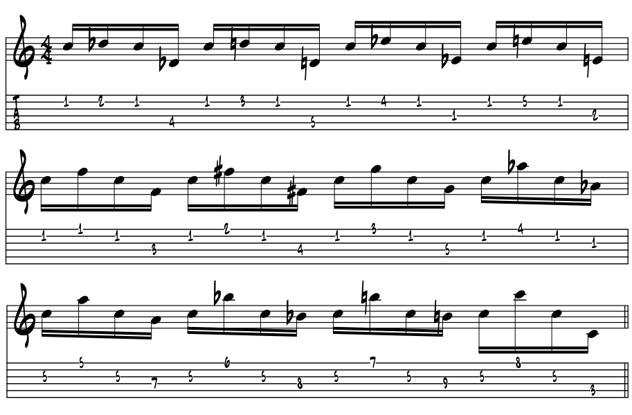 | Interval studies. Motivated players often include various intervals studies into their core training, to simply help get the resources they need completely under their fingers. Of course like many aspects of our musical development aside from theory knowledge, these are longer term shedding exercises that develop by necessity and morph on their own, as our own sound and style emerges. |