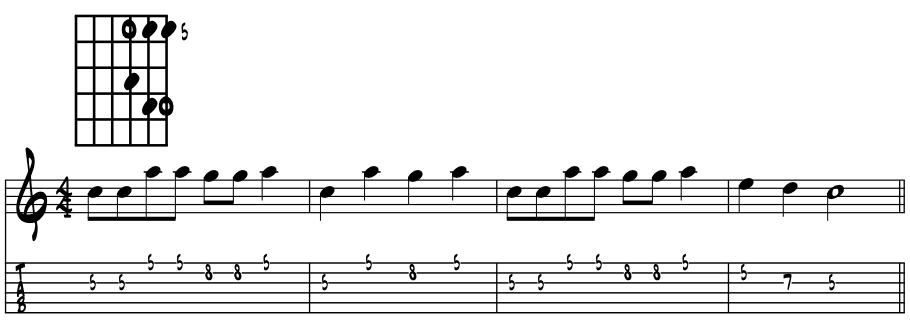 | Author's note. I've added in the major pentatonic scale shape in the last idea for folks new to guitar. This one shape can yield a lot of good melodic jamming. If necessary, start off by getting it under your fingers and finding the pitches and melody of "Shortnin' Bread." Then work at the rhythm, capturing the joyfulness in the line, as generated from the major pentatonic color. |