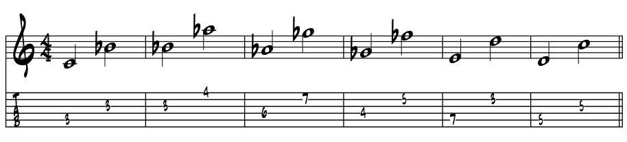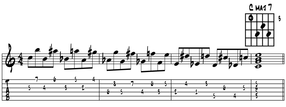 | Loops / the major 7th / leading tone / Seven. If like its inverse interval, the minor 2nd or half step interval, the major 7th interval will need all 12 occurrences to close back upon its starting point. So we'll need all of our pitches? Yep, all 12. Based on the octave transposition technique, this next lick creates an interesting feel, a descending chromatically enhanced, noire character of line, a mood which somehow vanishes with the sounding of the major seventh chord to close the idea. Example 6. |