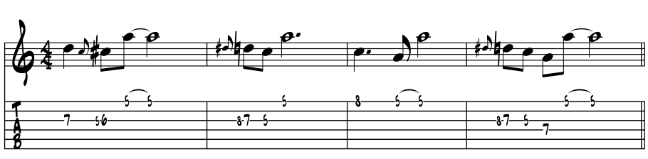 | Flat 7 in action. In this next idea is a total 'The Doors' inspired chant, whereby we're simply encapsulating the tonic with the blue notes b3 and b7. Generally an easy lick that gets good mileage. Learn it here if need be. Example 5a. |