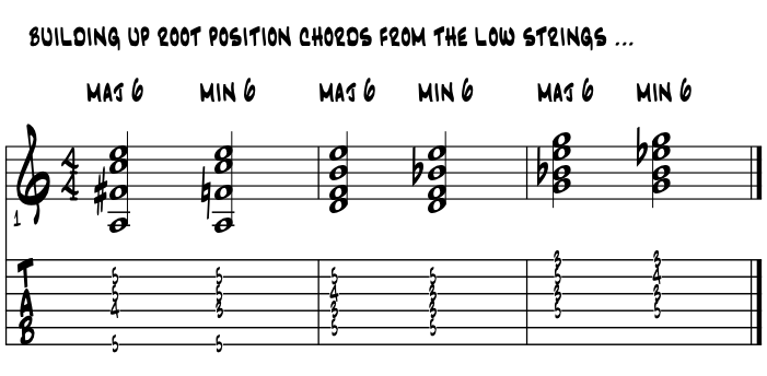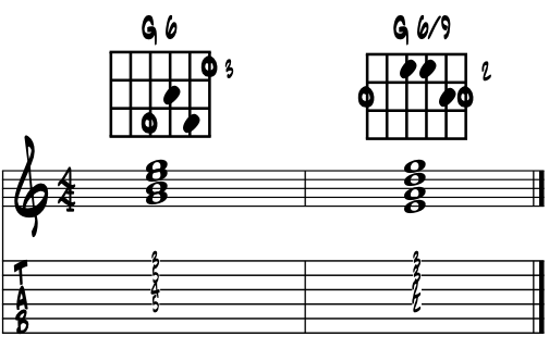 | Loops / major 6th chords. This interval also lends itself well to coloring both our major and minor triads. We often find the major 6th chord in the 'jump' blues and jazz styles. Tight and bright on the left, and some Hollywood on the right. Leave the bass note off the 6/9 and both of these shapes pop along real nice. Ex. 3c. |