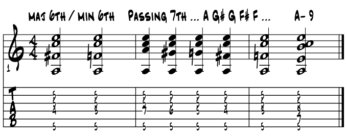 | So what? So just what is this in terms of the theory? Surely the 'F#' is a lean towards 'G' major. It's also a lean towards A melodic minor. If we voice the chords as in the above manner, we place the 5th, 'E' above either 6th, 'F or F#.' These are both fairly common chord shapes. Quick review. In the above passing 7th idea, we pass by the 7's through the major 6th to minor 6th, often a penultimate resting point before the final hold. |