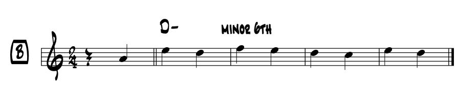 | In the bridge. In this next melody idea from a different song of mine, the minor 6th interval opens up in the bridge section of the composition. As the 'A' section pitches stay within a perfect fifth, the sounding of this minor 6th is also quite effective in bringing a poignant longing to the senses. Ex. 2b. |