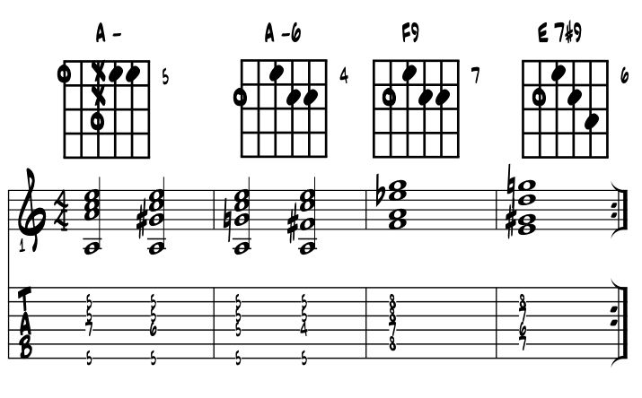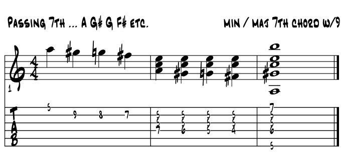 | More common in a minor key? This 'passing 7th' could very well be more common in minor. Same basic idea really, just backed this time by the minor triad. Along the way we we pick up the 'minor / major 7th combo chord color. Handy for us guitarists that get to back up poets, they ALL love this chord :) Makes their thing ultra ultra groovy. Another Hollywood chord? Probably. Regardless, passing 7th thinking in 'A' minor. Ex. 6d. |