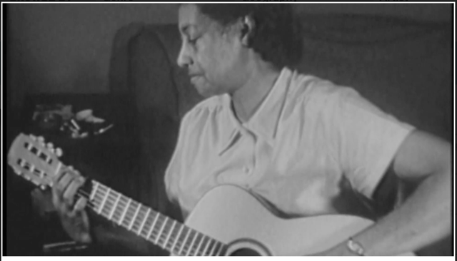 | Elizabeth Cotton ~ fingerstyle master picker. Among our earliest proponents of Americana folk music and songs is Elizabeth Cotton, pictured here (note right handed guitar (?) played opposite way). Self taught as guitarist and composer, Ms Cotton's harmony, chord progressions and banjo-esque picking style captures together an early sounding of Americana's magics by blending diatonic triads with 'V7 of V' colors; all reminiscent of early carnival, vaudeville and dixieland musics. Ms Cotton's song "Freight Train" is today a top 'standard' in the folk book, and might be a good song for beginners to get acquainted with. Super nice bass pulse sets the gradually accelerating pace all on through the classic folk story progression. Hear Ms Cotten's guitar magic, key of 'C.' Example 4. |