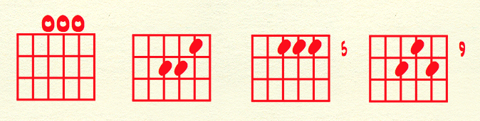 | Cool ? These chord shapes, and finding passing tones and such in between, provide the chords for many a song. Add in a capo to find the right notes for your voice and things will blossom right quick with daily shedding. |