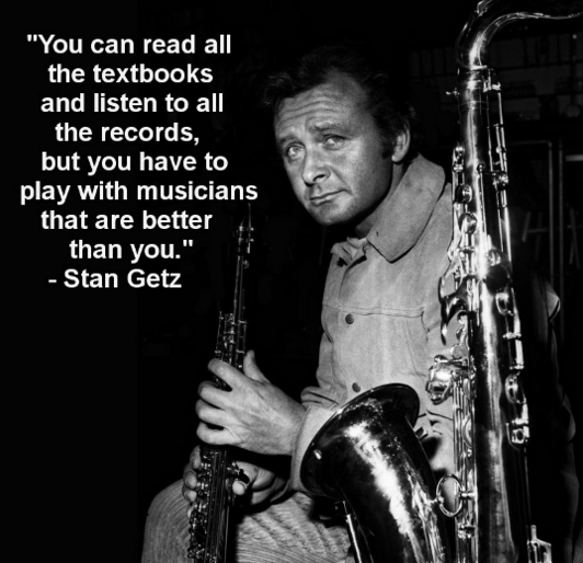 | Warm up. Wherever you might be in your development with music and where you're trying to get to, like any physical / mental tasking we enjoy, a brief warmup to the tasks at hand can help. Fifteen minutes of scales shapes, arpeggios, motion between chords running tricky licks all contribute to a better performance. Playing consecutive choruses of 12 bar blues, with whatever changes in any key, is a sure way to get the creative juices flowing. You choose and know that over the years it'll change, as your musical endeavors change. Down the road, just the physicality of warming up our chops makes a real difference under the lights. |