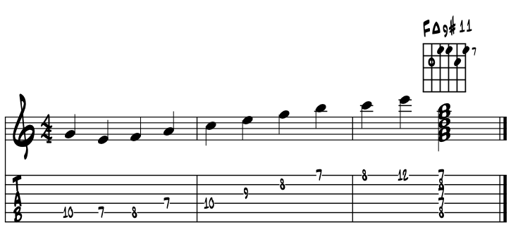 | Ascending Lydian character. The major third A above the root creates the major tonality and the initial three whole steps of this grouping provides that wisp of whole tone color. So very often we'll find this B natural up an octave as the #11th colortone of the arpeggio. The #11 eases including the major 3rd in the chord triad basis; (major 3rd 'A' and #11 'A#' in the same chord). Ex. 9a. |