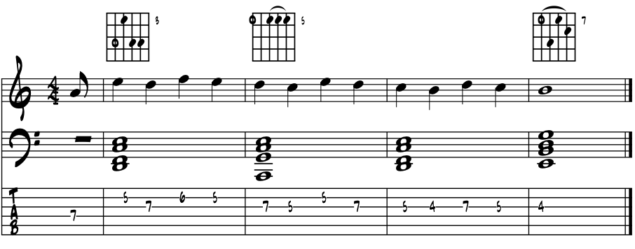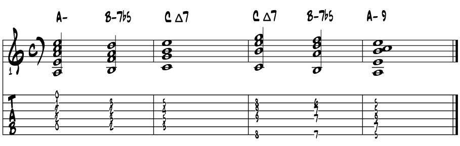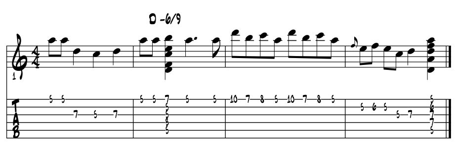 | Descending Dorian sounds. Even without supporting changes, the powerful, minor character of the line emerges. This has a very rock / fusionesque character, or could with the right gear. A bluer start reaching up to A, then a quick leap to the B natural where the minor 6/9 chord is struck. A repeated descending eighth note pattern encapsulates the minor triad and sets up the motion to our solid minor triad resolution. |