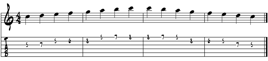 | Of course the reverse of this description is also true, that a scaler descending major scale line is just as directional and confidently resolving. Here are both. Remember, do try and sing or hum along with the pitches in all of the examples. Sing and play is the Americana way. Follow along the notation for reading too. Example 6a. |
