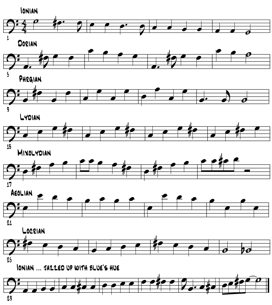 | How cool is that? Hear the changing emotional character in the lines ? Cool. The basis of our bass line stories ? Maybe, surely the modes have been a historical part of our musical storytelling all along :) |