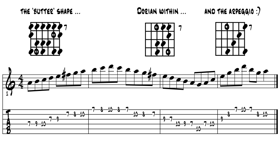 | Dorian and the 'butter' shape. Well, even though Dorian is everywhere on the neck, its handiness and proximities in the 'butter' scale shape is nothing short of legendary. Talk about built right in, bolts right up and gives us a rather scootable arpeggio too :) Example 7b. |