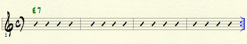 | Bass modes, modal bass lines, bass line stories and the modes. This is tricky all 'round. While these next few idea are as cliche as possible, aiming to better get the flavor of each of the seven modes, and thinking bass line story, so a basic line that could be worked into a modal song, for each of the seven groups. All in one swoop, the quickness in the playback line is to 'blur' one mode color into the next, each blur one of the seven. Starting with Ionian in 'G', and right on through the diatonic. Example 16. |
