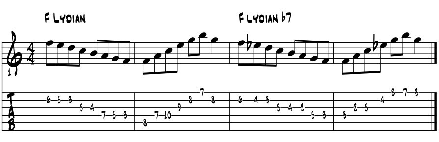 | Definitely a slight variations of flavor there yes with the Lydian b7 color. The ascending arpeggio in bar 2, with its handy fingering and shape, is a keeper for sure. In bar 4 some, the essential jazz guitar fingering philosophy applies. |