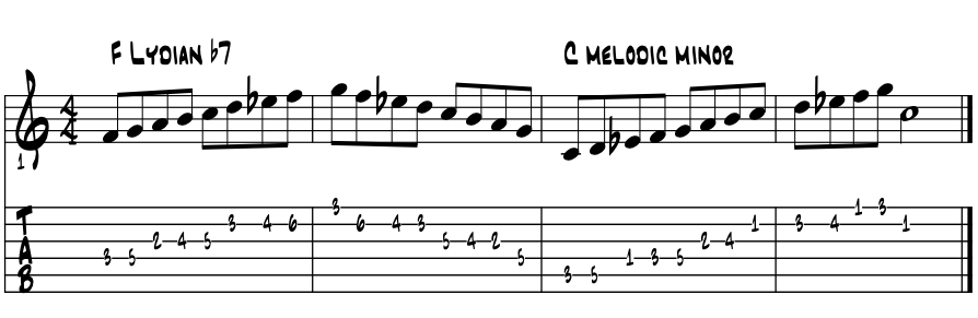 | Lydian b7 dominant mode. As we've created our modes from different starting points within one defined set or loop of pitches, turns out that we've the common melodic minor scale starting from Five of Lydian b7. Please examine the pitches. Example 9d. |