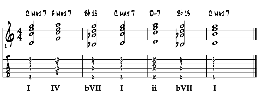| Mixolydian flat Seven cadential motions. This next idea might be the most important one in this whole for some readers. Turns out that if we build a dominant chord on 'b7', we get an earthy cadential motion back to One. Having some variety for V7 is cool and while we do have a ton of it with 'b9' substitutions and forward, this 'b7 to One cadential motion is a modal coloring of the harmony, maybe leaning more to a pop rock essence and of course 'flat Seven' can always bring some blues. Here in 'C' major. Example 10cc. |