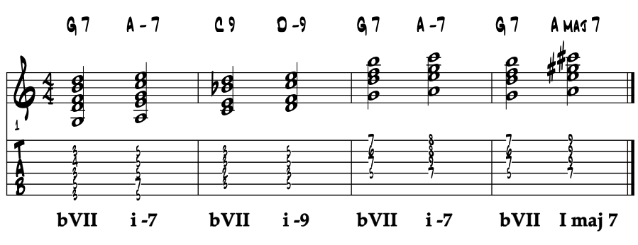 | Sound a bit modal but with a strong sense of resolution? Cool. Work in minor? You bet. No surprise that there's a ton of this all through the 'Lads from Liverpool' library. Hard bop monsters too a la Art Blakey And The Jazz Messengers. There's a few other fairly common chord shapes to find this 'b7' resolution for starting out with using modal colors with the harmony, here adding in motion to a minor tonic. Example 10d. |
