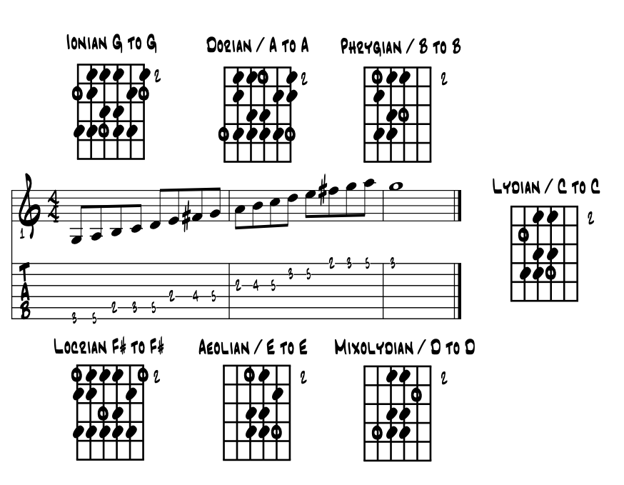 | ~ Dorian Phrygian Lydian Mixolydian ~ ~ Ionian Aeolian Locrian ~ ~ ancient colors and Glarean ~ ~ theory / history evolutions ~ ~ today's relative major minor ~ ~ letter name modal theory secrets ~ ~ the now ancient 'hypo' weave ~ ~ modal composition and improvisation ~ ~ guitar: seven modes over five shapes ~ ~ coda: modal colors in open 'G' tuning ~