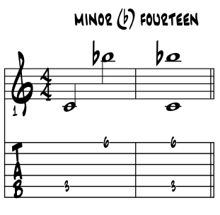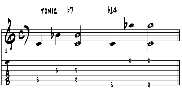 | So why b14? Simply in that our flat Fourteen is just our blue b7th moved up an perfect octave. Having never seen this chord numeral in the literature, we include it here for thoroughness and that perhaps it provides a clue to one, to invent something anew ? Please examine the pitches and their corresponding numbers in thinking from the root pitch C up to flat Fourteen. Example 1. |