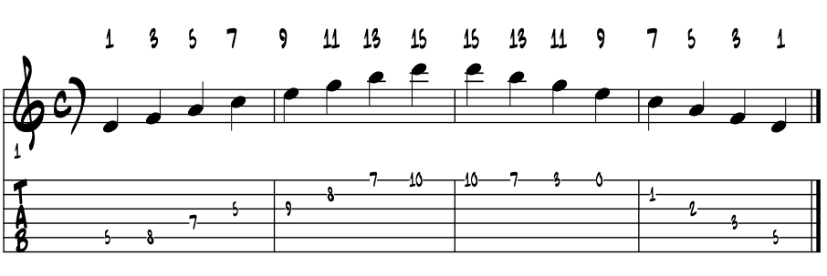 | Symmetrical Dorian loop is perfect. Another way we can get clear up two full octaves to 15 and perfect closure is by creating an interval loop with minor 3rd / major 3rd / minor 3rd / major 3rd till our loop closes back upon its starting point. Please examine the pitches as this symmetrical interval sequence creates Dorian minor. Thinking D Dorian minor. Example 2. |