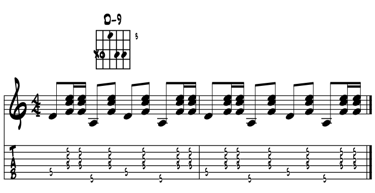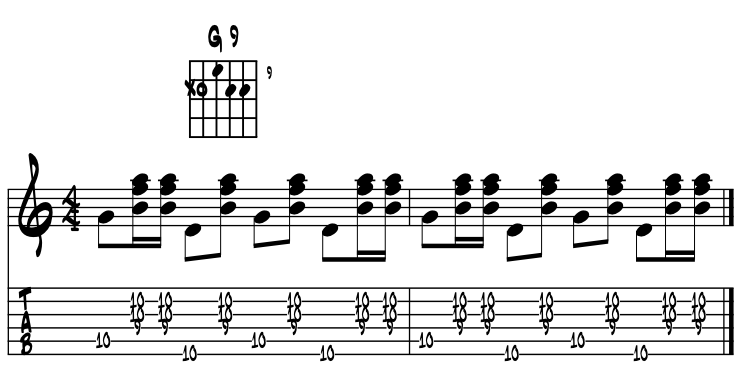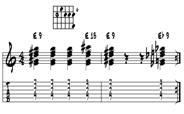 | The ultimate funk chord. The first real band I rehearsed and gigged with was an 80's funk band. Hired as the rhythm guitarist, to play changes behind the soloists, this 'E9' was staple chord. The voicing is a solid, little chunk of harmony that gets thrashed around, often with a light pick towards the bridge pickup, it locks right in with drums and open note 'E' on bass, to get the dancers up. Here in the key of E blues, this root position chord easily runs up and down the neck to cover all the funky keys. Example 6. |