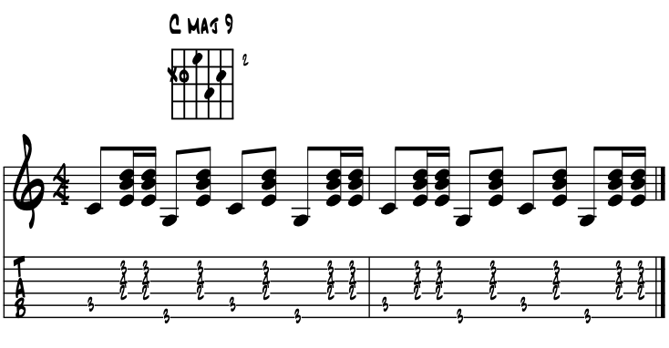 | Tonic bossa Nine chord. This next chord is probably the top 'go to' bossa tonic chord in songs written in a major key and features the major 9th interval on top. Here written in C major and a movable chord form, it alternates the bass pitches (x = the 5th). Example 6. |