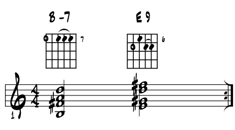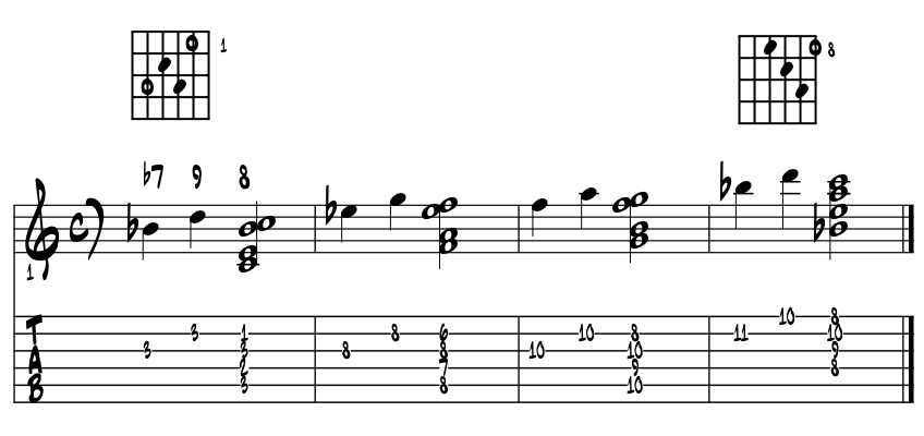 | Additional dominant / V9 voicings. Here are a couple of additional essential V9 chord voicings for the emerging modern guitarist. The first two are fairly common as Five chords in the Two / Five / One cadential motions. The second two voicings live a bit deeper into the harmonic vocabularies. Just nice to have options. Example 8. |