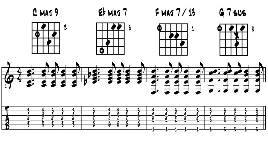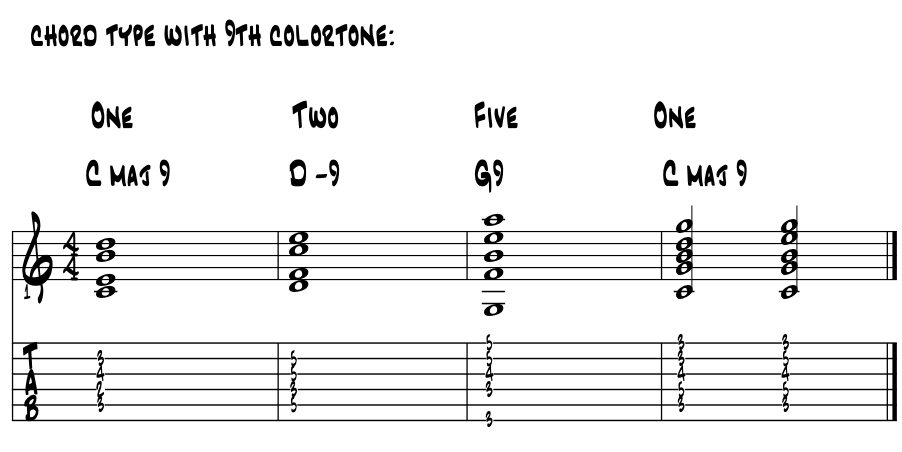 | Major 9 as a common tone. As cool as it might ever get, fairly straightforward chord shapes yield endless dance / vamp powers of colors. In 'C' major, holding its major 9th, 'D' between tonic One, bIII maj 7, Four and Five. Example 5. |