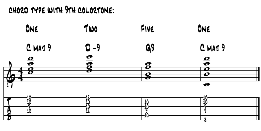 | Find some other voicings. Those last few chords are a bit thin yes? Here's some thicker sounding chords, one of each of the three chord types featuring the 9th color tone. Example 5b. |