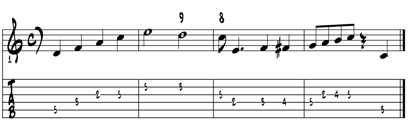 | Nine in the melody. Melodies in the minor key that focus on the 9th take on their own unique emotional character. There's a sense of longing, a searching with a warmth of our hearts that lives in the Nine color. In this next idea, a Jacmuse original, we start our chord progression on Four and work our way back to resolve to One, all in the key of D minor. Our melody uses the Nine to end the line. Example 3. |