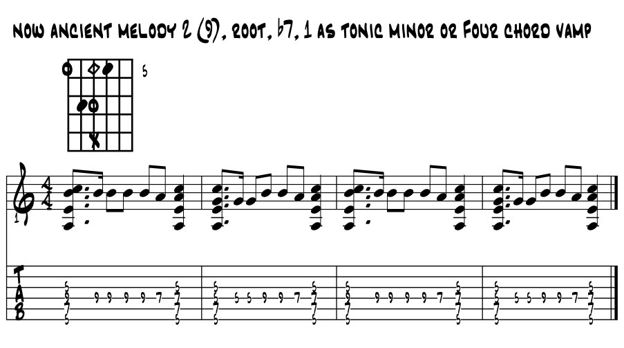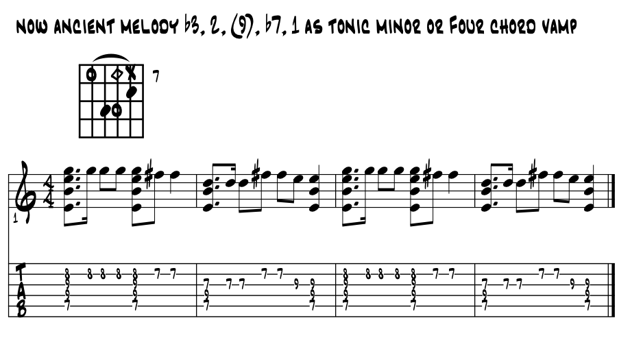 | Nine in the line; b3 / 2 / b7 / 1 in minor. This last idea in these motions with 9 in the line is a potent one. Must go way back, it's just a hoot to play, but go gently as it evokes a deepness and gravity of heart very quickly. Here in 'E' minor, tricky at first, with a potential ton of variations. Example 4c. |