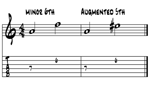 | Theory names; the submediant, minor 6th, #5. Like all of our music intervals, their numerical name is simply based upon how many steps they are away from their root or tonic pitch. Thus we can locate our minor sixth interval, six diatonic steps up from our root pitch. The minor 6th generally implies minor key and scale, so thinking our root or tonic pitch is A, the following pitches for minor 6 / #5 emerge. Example 1. |