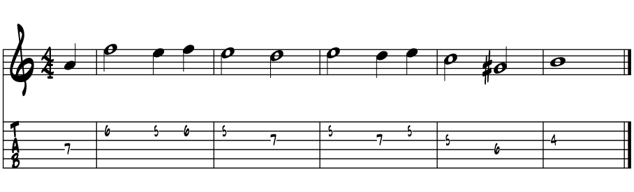 | A minor 6th melody. The interval leap of the minor sixth above the root, at least in a personal way of hearing things, creates the strongest sense of a longing yet loving poignancy when compared to all of the intervals within the octave span of the minor tonality. Dig this sound in the song "My Skye Is Blue", which features the minor 6th leap in the opening measure and closing out the phrase with a borrowed leading tone from its harmonic minor potential. Example 2. |