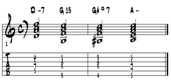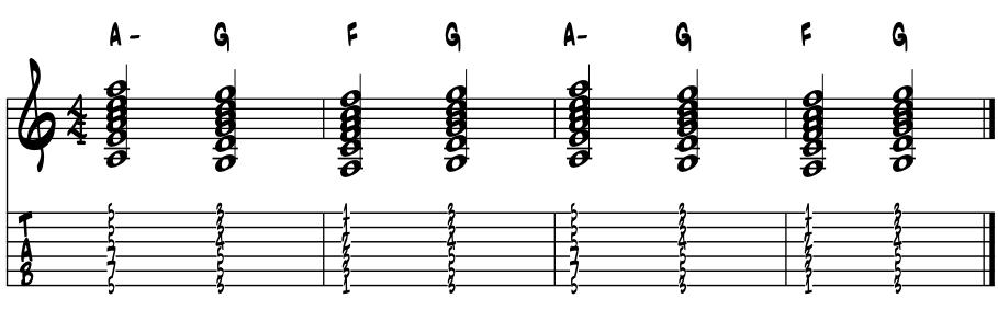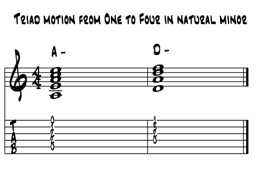 | Motion from One to Four in natural minor. As the chordal motion from One to Four is probably our most common chord progression in folk, blues, rock and pop, this flat Six position is key in creating the diatonic triad built on Four. Please examine the pitches, again we are thinking in the key center of A minor. Example 3. |