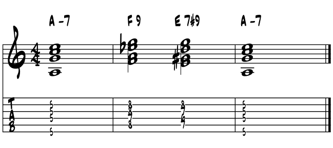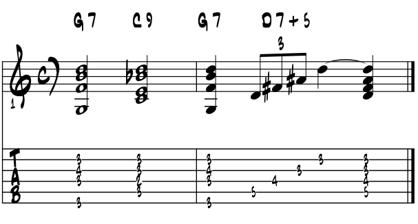 | In the blues. In the blues we can have everything. And in jazz blues, all 12 pitches will always find a welcome home in the blues, somewhere. A perfect spot for this V7#5 rascal is as the closing chord in a chorus of blues. Example 8. |