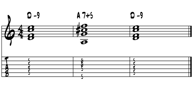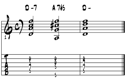 | Finding a common tone. Based on an augmented major triad, our V7+5 functions in a dominant chord capacity, usually directing the music towards resolution of a key center, to a new event, cadential motion etc. Thinking D minor, we use the #5 as a common tone between our minor One and Five chords. Example. 6. |